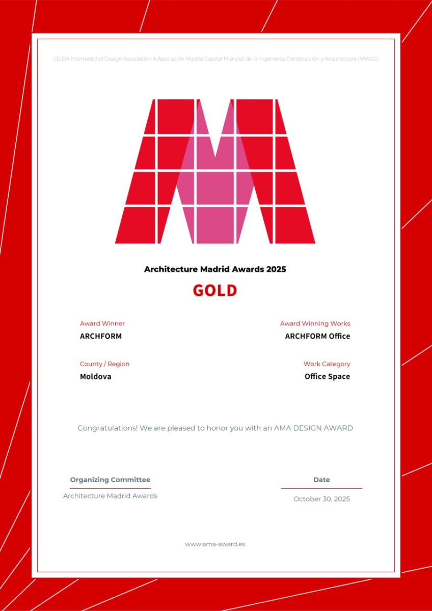 Недавно я писал о трёх международных премиях, которые архитектурное бюро ARCHFORM получило за один месяц. Но эта новость уже нуждается в обновлении. Ещё одна победа, и снова золотая. И что особенно символично: награду получил проект, который ARCHFORM создавал прежде всего для себя – это собственный офис бюро в Кишинёве.