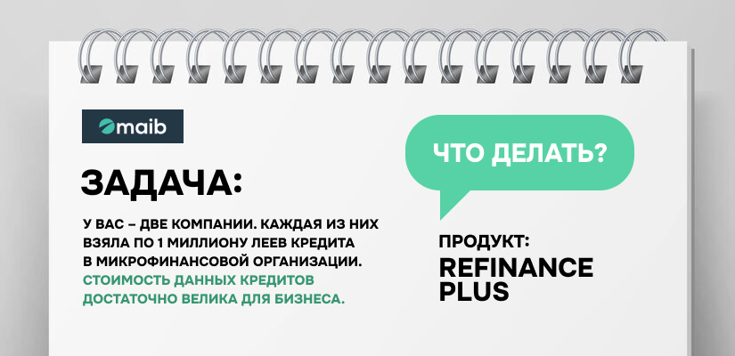 Вы обращаетесь в maib, чтобы получить возможность воспользоваться продуктом «Refinance Plus». Как юридическое лицо вы можете воспользоваться финансированием в размере до 3 000 000 леев с залогом или 1 500 000 леев без залога. Выдача кредита максимально упрощена. Главное, чтобы у вас был прибыльный действующий бизнес и не было просрочек по возвращению кредита и уплате процентов.