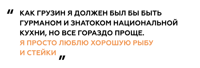 Как грузин я должен был бы быть гурманом и знатоком национальной кухни, но все гораздо проще. Я просто люблю хорошую рыбу и стейки.