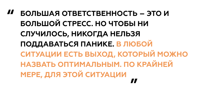 Большая ответственность – это и большой стресс. Но чтобы ни случилось, никогда нельзя поддаваться панике. В любой ситуации есть выход, который можно назвать оптимальным. По крайней мере, для этой ситуации.