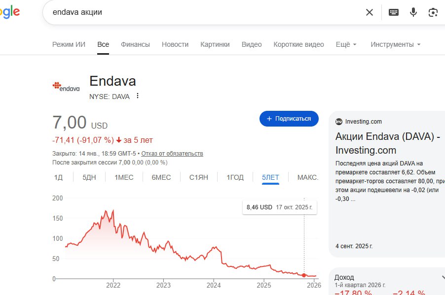 С почти 200 долларов за акцию в 2022 году цена акций Endava опустилась в начале 2026 года до 6 долларов.