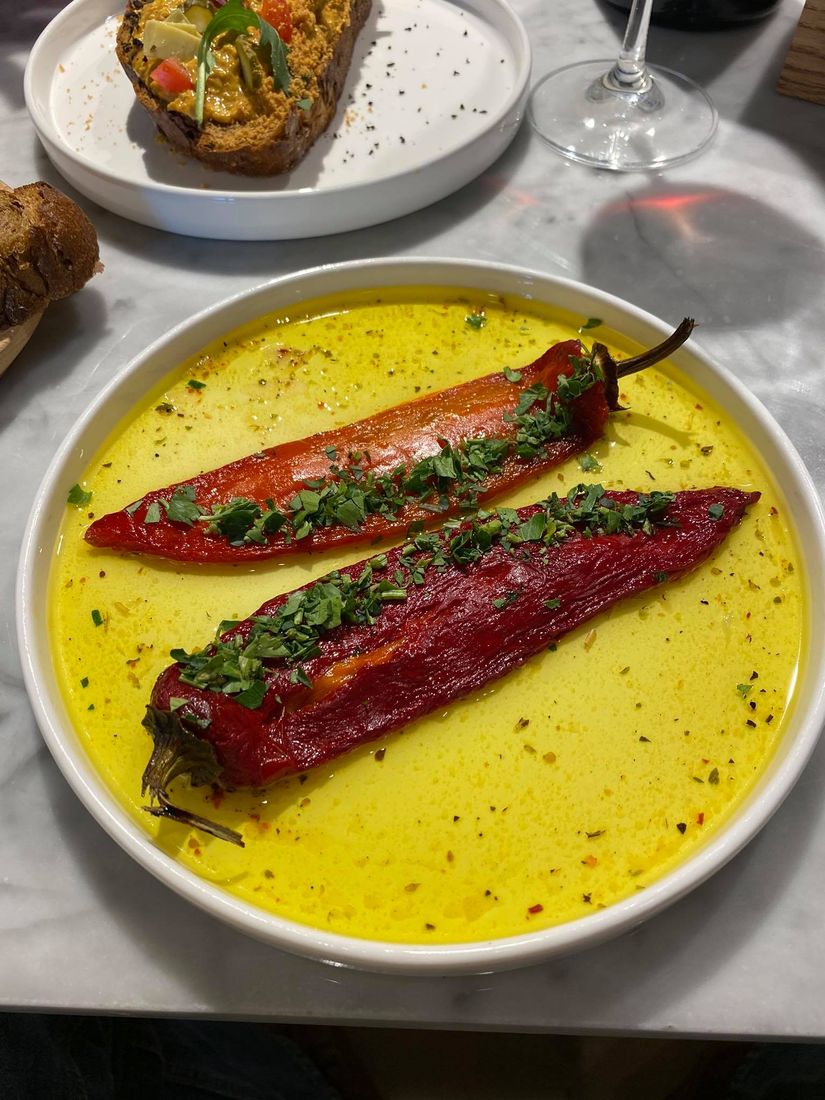 Почему блюдо называется «Испанский перец»? Это рецепт такой. Перцы для него используются того сорта, который называется «Капия». Но, как бы кощунственно это не звучало, но главное в этом блюде соус. Да, там есть нерафинированное оливковое масло, которое дает соусу цвет. Но это далеко не все. Соус сделан на меду. В него добавлена куркума и прованские травы. И сок лайма. Не ешьте это блюдо просто так. Это тоже кощунственно. Отрежьте кусочек перца. Подцепите его на вилку. Отломайте кусочек хлеба. Обмакните его в соус. И смешайте все это во рту. И – глоток вина. Кстати, в Crosta есть в винной карте Chateau Cristi. Так что мне было легко его рекламировать, а вам будет легко его попробовать.
