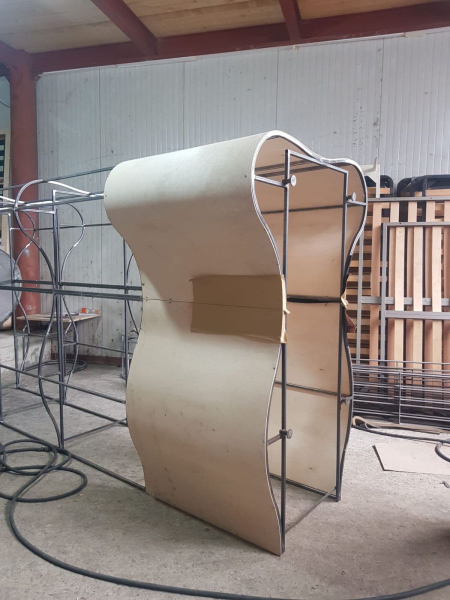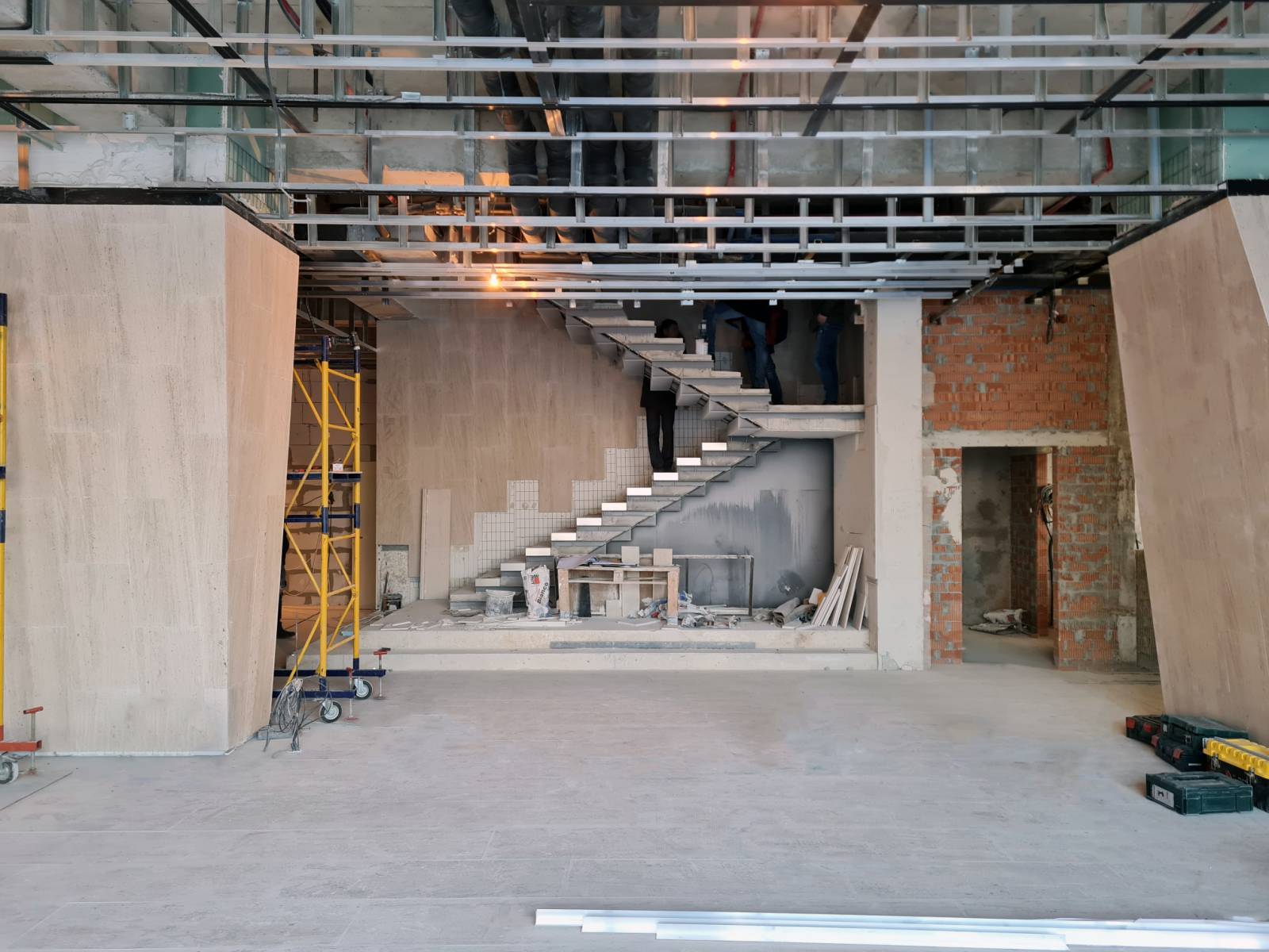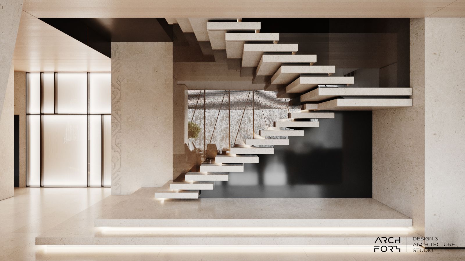 Значит мы добились нужного эффекта. Ощущение, что лестница парит создает псевдообъем, который закреплен на специальном металокаркасе.