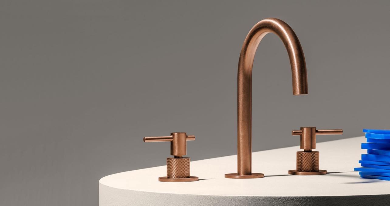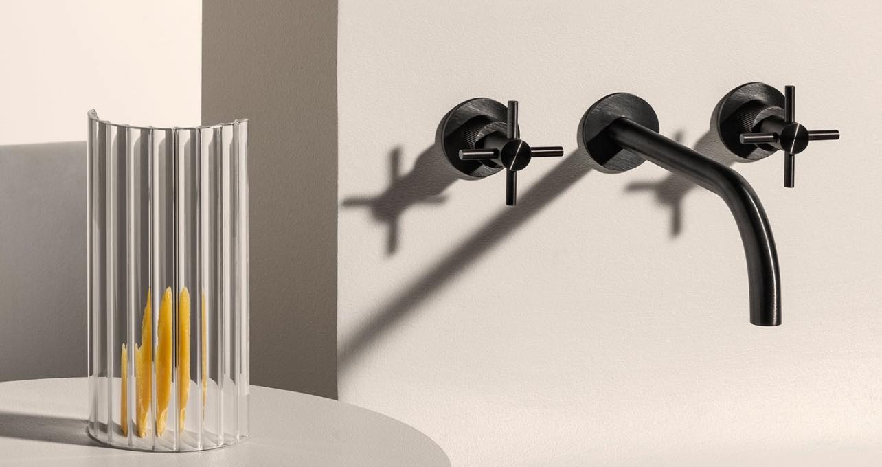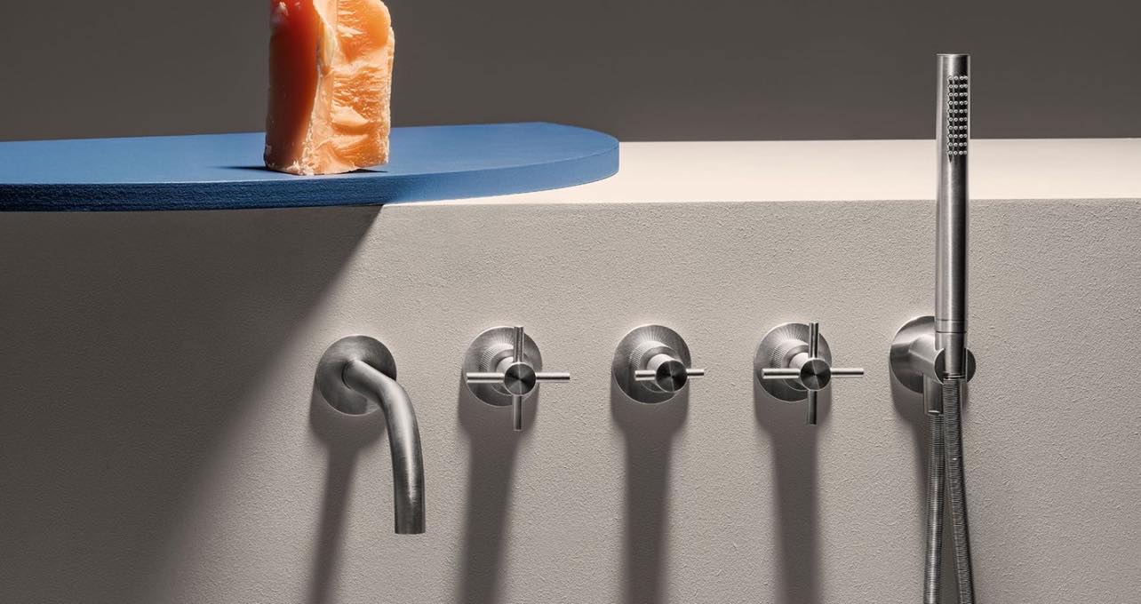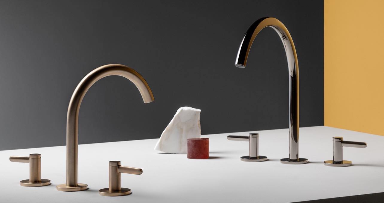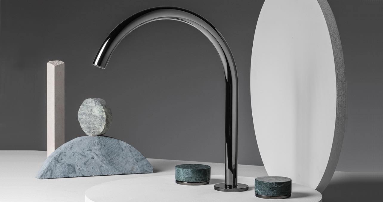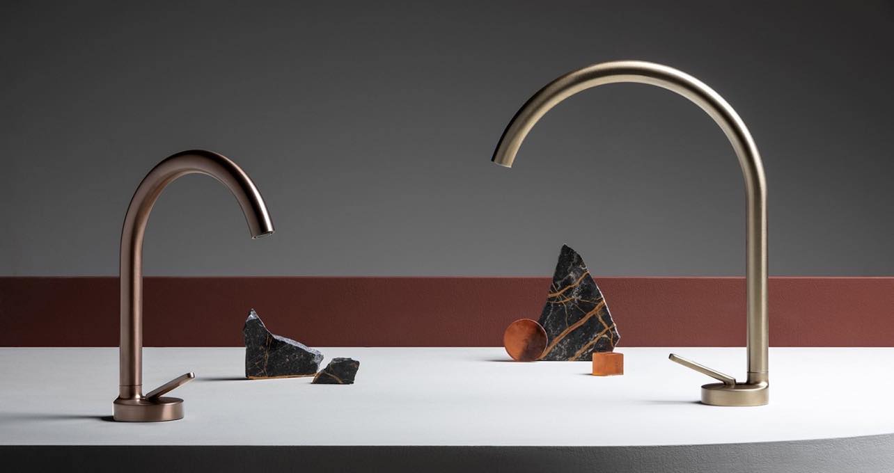 Смесители Zucchetti. Опять же, давно знакомая мне фабрика, сейчас вы сможете приобрести ее изделия у нас. У них большой каталог и много решений и по цветам, и по материалам. Обращают внимание их смесители, предельно лаконичные. Не часто встретишь такой минималистический вариант, когда картридж от смесителя спрятан под столешницей, а на виду только сам кран и ручка управления. Или смесители с ручками из натурального камня, но не в «классике», а в модерне. Плюс использование энокса вместо хромирования, причем в разных оттенках.